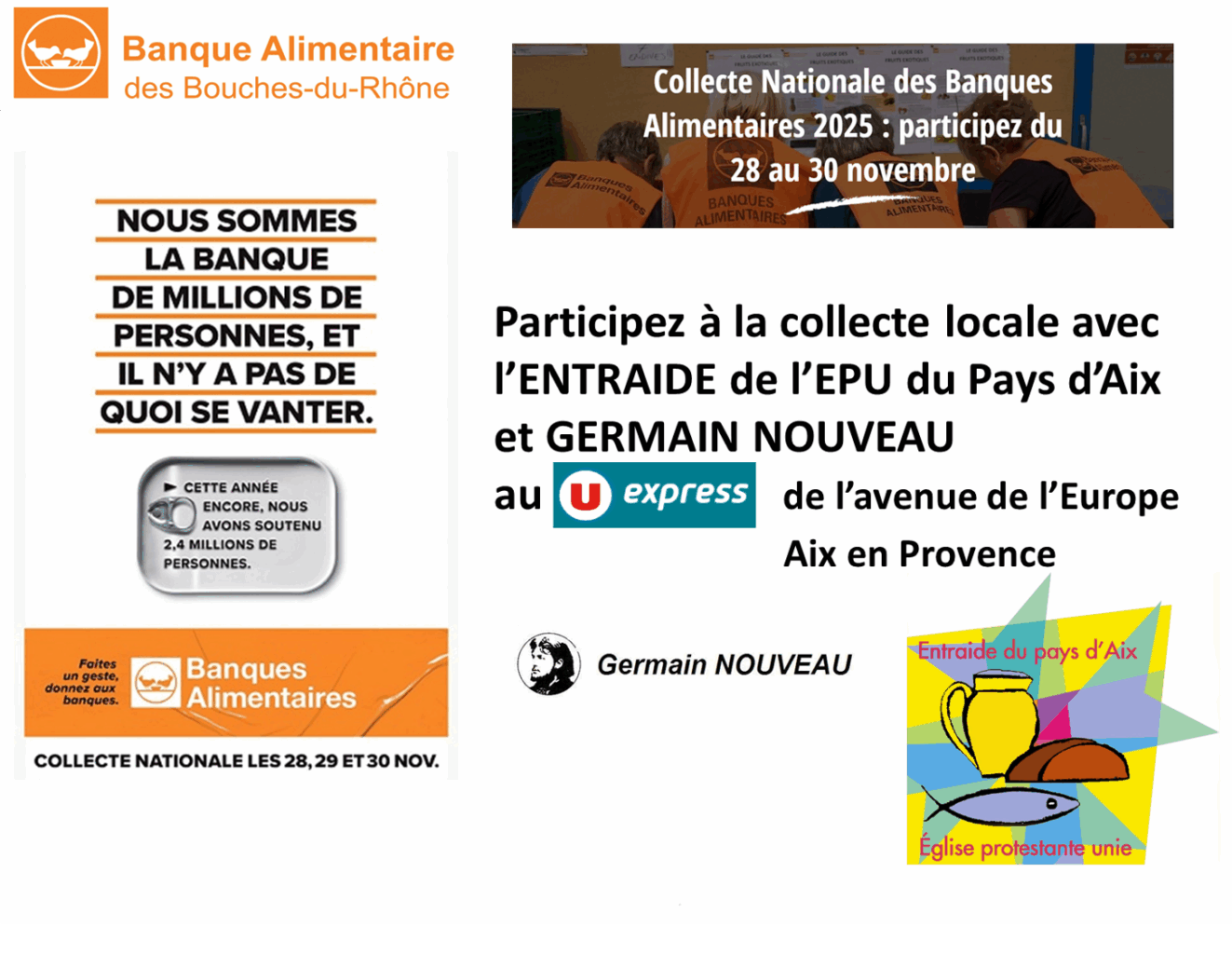 Participez à la collecte locale avec l’ENTRAIDE de l’EPU du Pays d’Aix et l’association GERMAIN NOUVEAU au U EXPRESS d'AIX EN PROVENCE, avenue de l’Europe, les 28 et 29 novembre 2025.