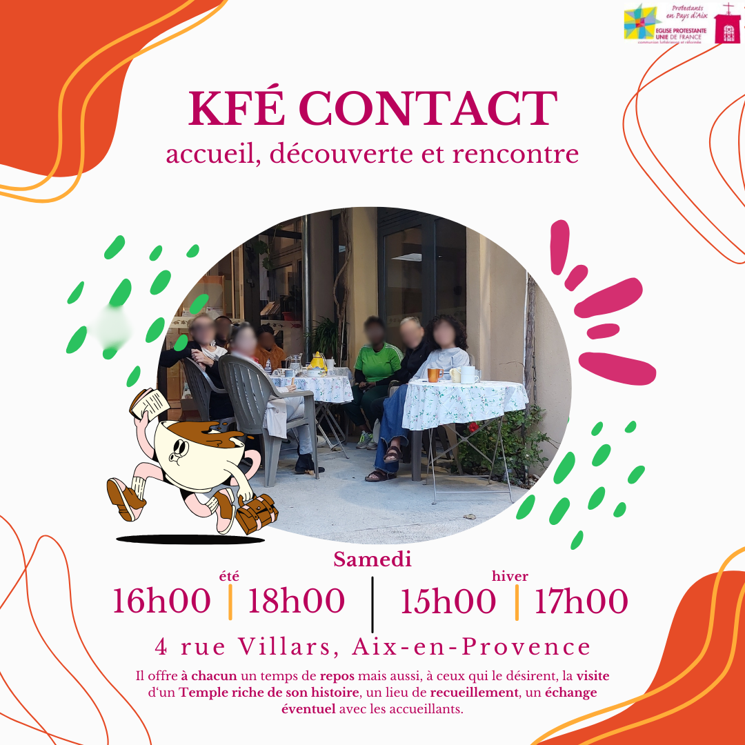 Kfé-contact, espace d’accueil, de découverte et de rencontre au centre d’Aix, ouvre au public les portes de notre église le samedi de 15h00 à 17h00 l’hiver, de 16h00 à 18h00 l’été.